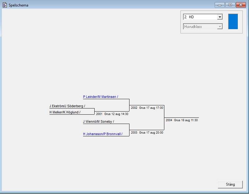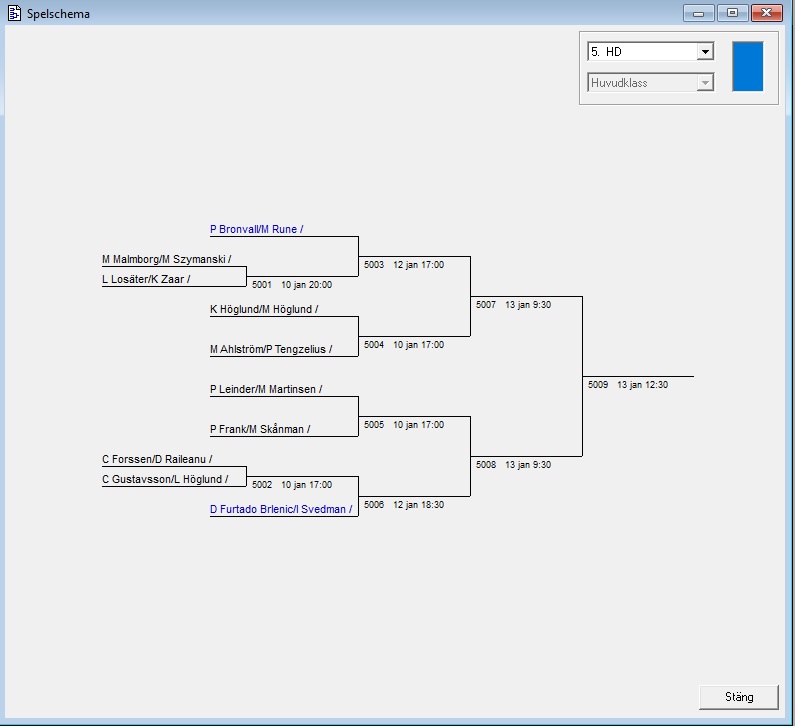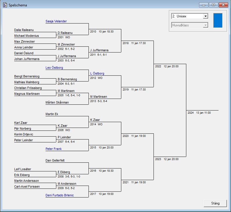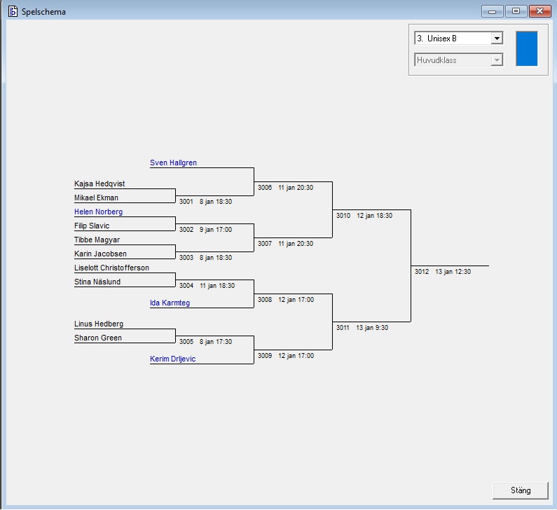 De som var anmÀlda till Unisex B klassen flyttades till Unisex. De andra klasserna blev inte av pga för fÄ anmÀlningar tyvÀrr. Lottningen med tider och datum hittar ni nedan! Lycka till alla deltagande!