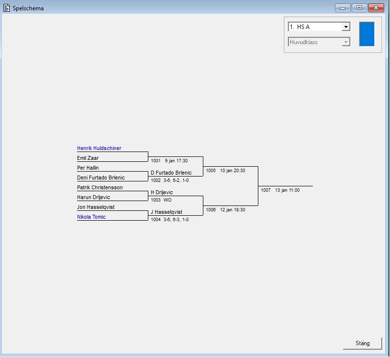 KM 2018 Àr nu fÀrdiglottat och redo för spel! Kika pÄ alla spelscheman nedan! Alla matcher spelas bÀst av 3 set med ett supertiebreak (tiebreak till 10 poÀng) som avgörande set vid 1-1. Tiderna pÄ schemat gÄr efter "follow by" stilen dÀr man drar igÄng sin match nÀr matchen före Àr klar. SÄ försök vara i hallen minst 20 minuter innan match start ifall tidigare match skulle vara klar spelad. Resultat fÄr ni gÀrna skriva upp pÄ schemat vid anslagstavlan nere vid omklÀdningsrummen samt rapportera till Richard, Jasmin eller Paulina som borde vara pÄ plats.
